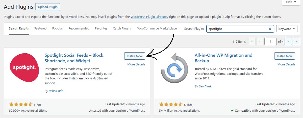 Then, install the Spotlight plugin, which will help you create and display your Instagram feed.